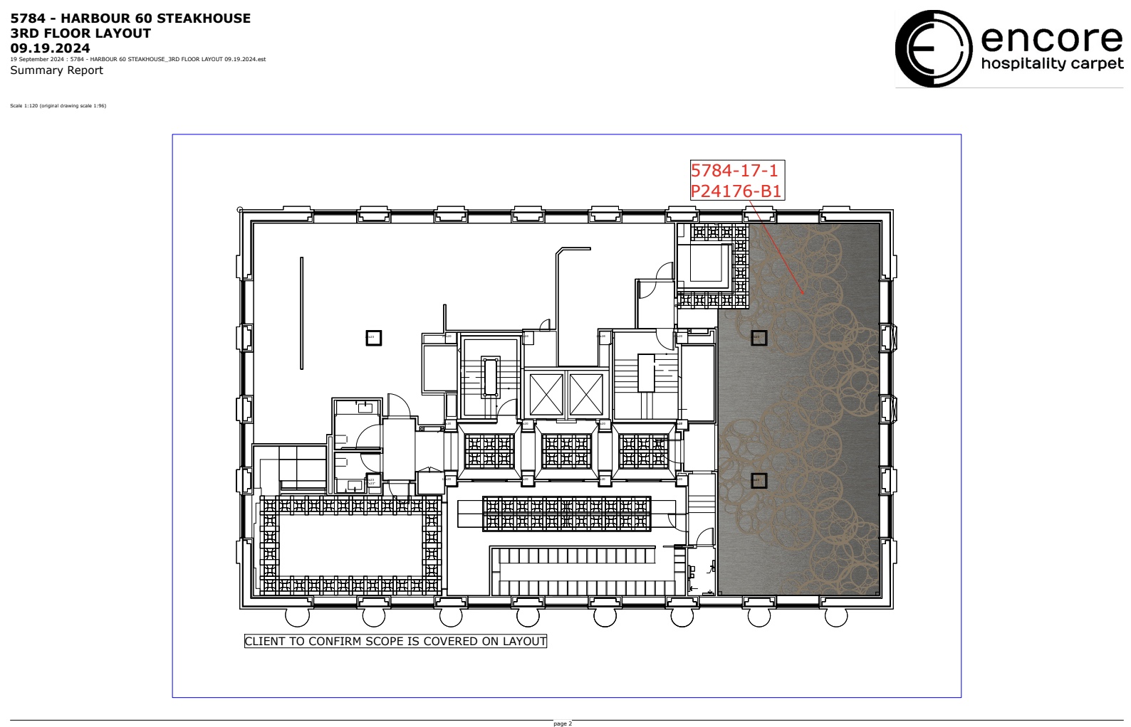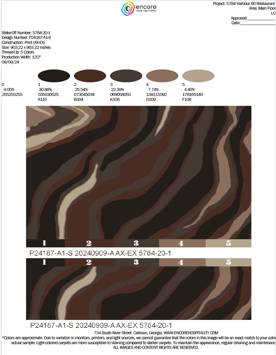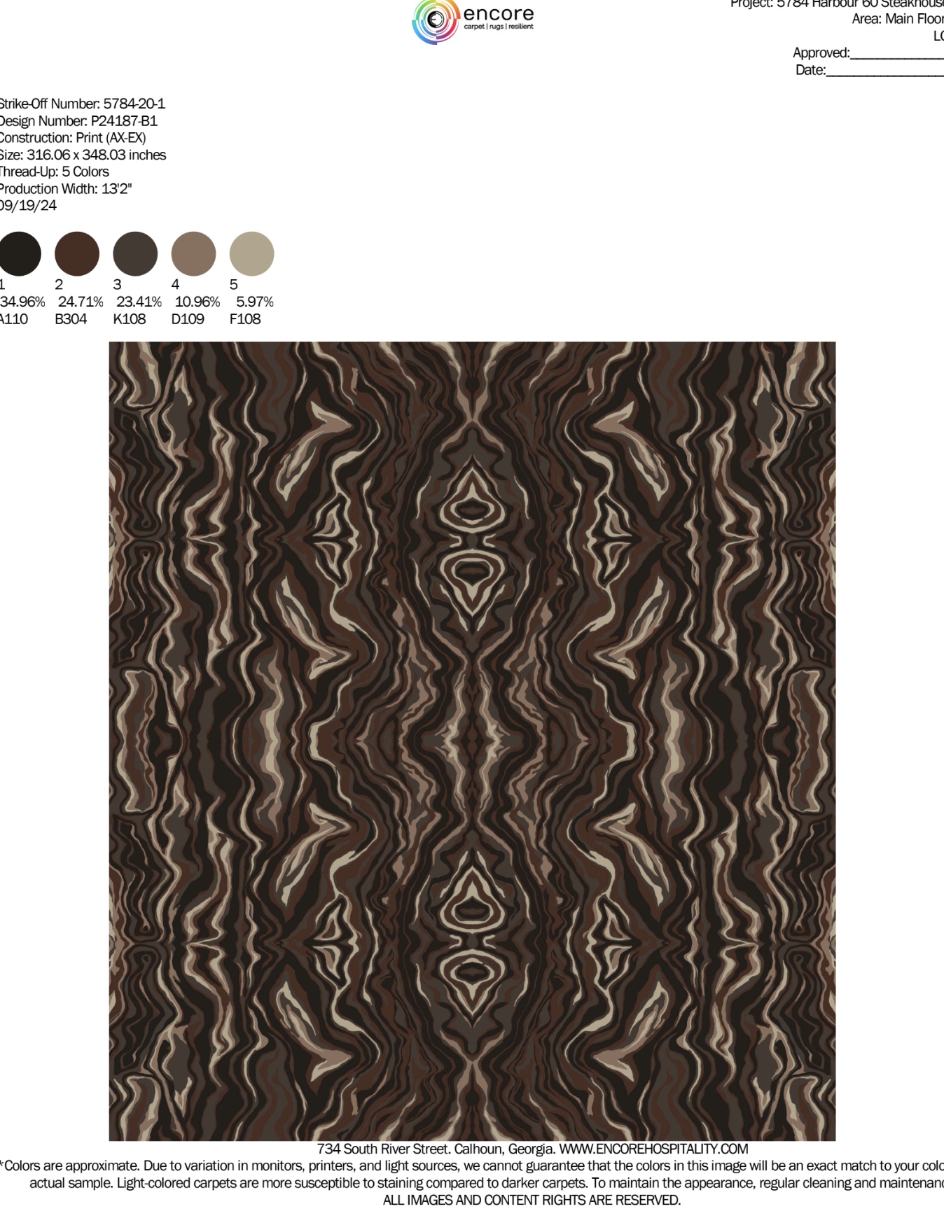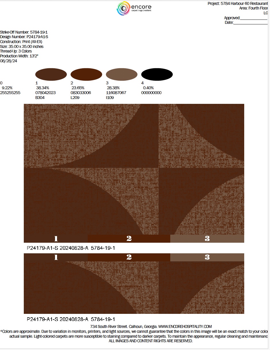 Encore’s Axminster Express was selected for its ability to deliver both high-end aesthetics and performance. For Harbour Sixty, the custom carpet design featured a rich, dramatic palette: deep browns, greys, and earthy red undertones—tones chosen to complement the restaurant’s moody lighting, polished wood, and bold architectural details.